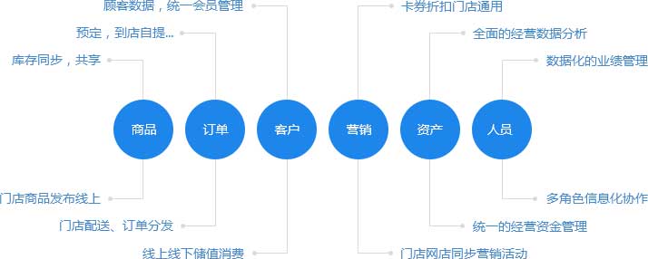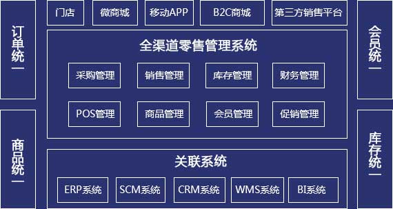 “帮助连锁零售企业打通实体门店渠道、电商渠道、移动电商渠道,联通供应链和财务,统一采购、统一商品、统一价格、统一会员、统一促销、统一配送,实现店商+电商一体化运营”